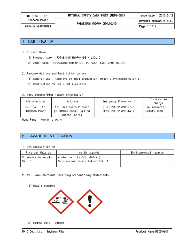 Potassium Hydroxide 45 solution Other Means of Identification. Potassium Hydroxide 10 wv Safety Data Sheet according to Federal Register Vol. Documentation of Training signature of all users is required Prior to conducting any work with potassium hydroxide designated personnel ie.